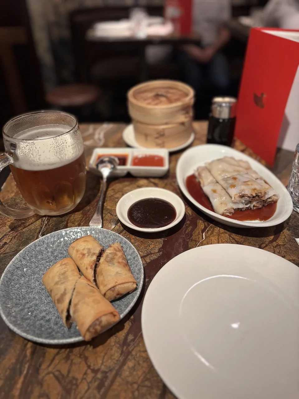 At the Duck and Rice, meanwhile, lunch service was winding to a close. I had 15 minutes to choose some grub before the kitchen closed, the waitress told me, which is exactly the sort of challenge I embrace. Crispy duck roll, Char sui cheung fun, Steamed har gui prawn. Bosh, as I believe the kids say.